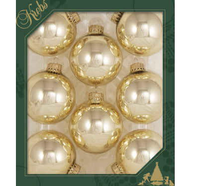 Tiffany gold round glass ornaments with gold caps are an elegant edition to any tree. 8 per window box packaging.